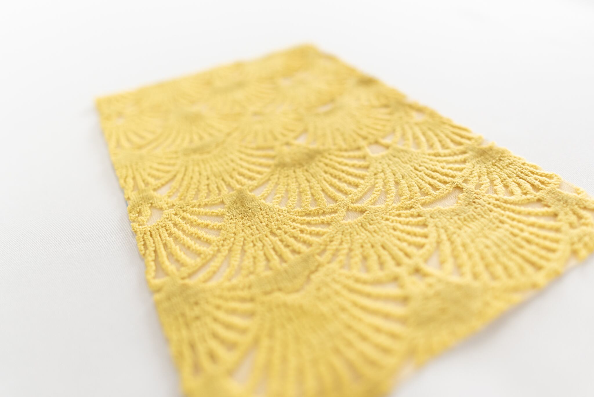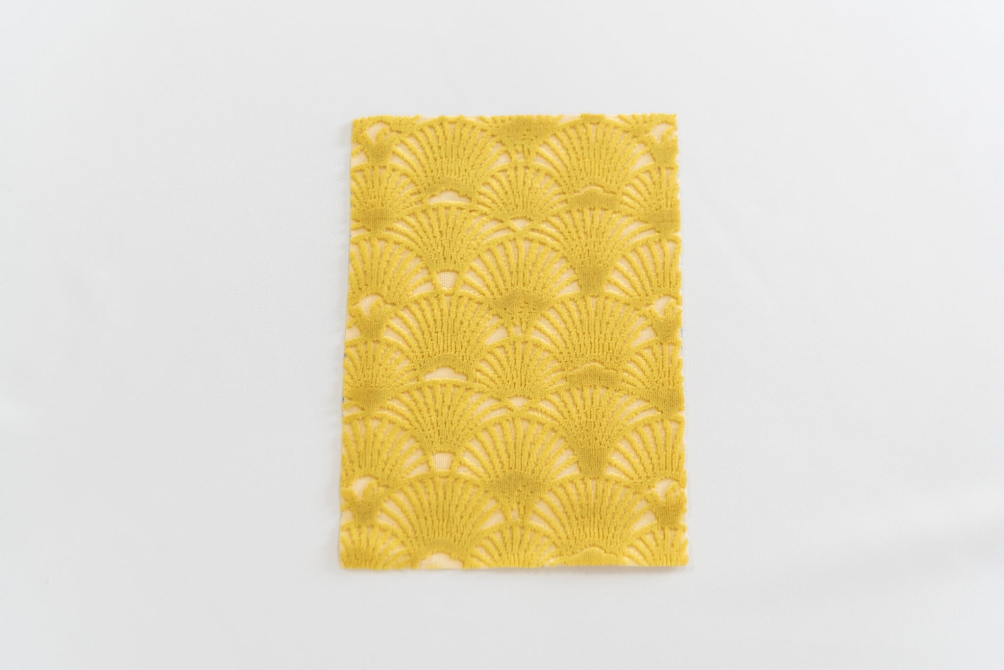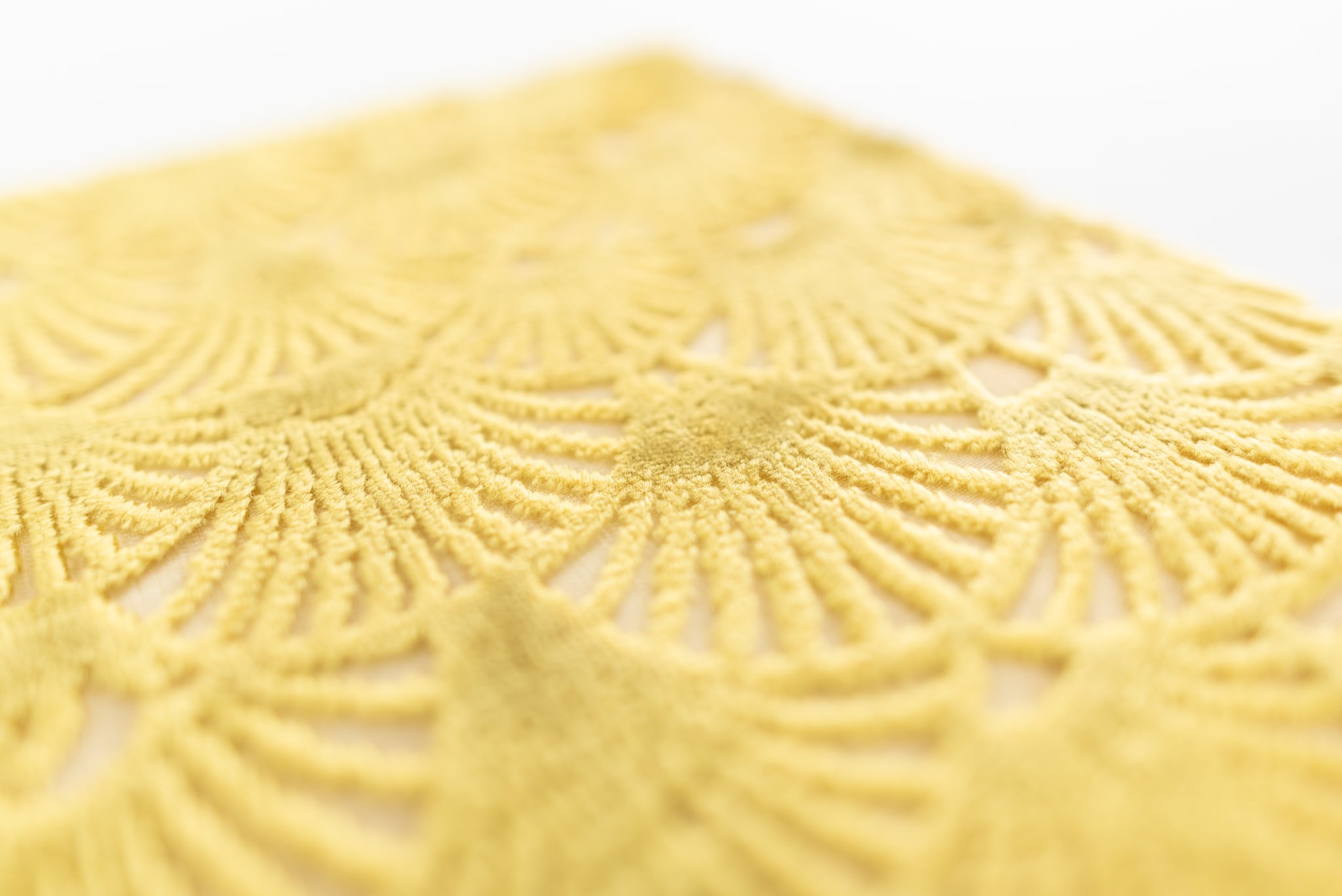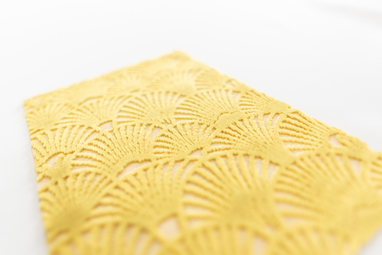 花銀杏イエローは、優しい風合いの麻地に立体感のある末広がりの縁起のよい扇型が施された、季節を問わないデザインとなっています。